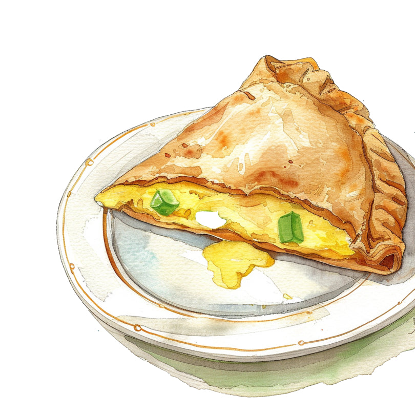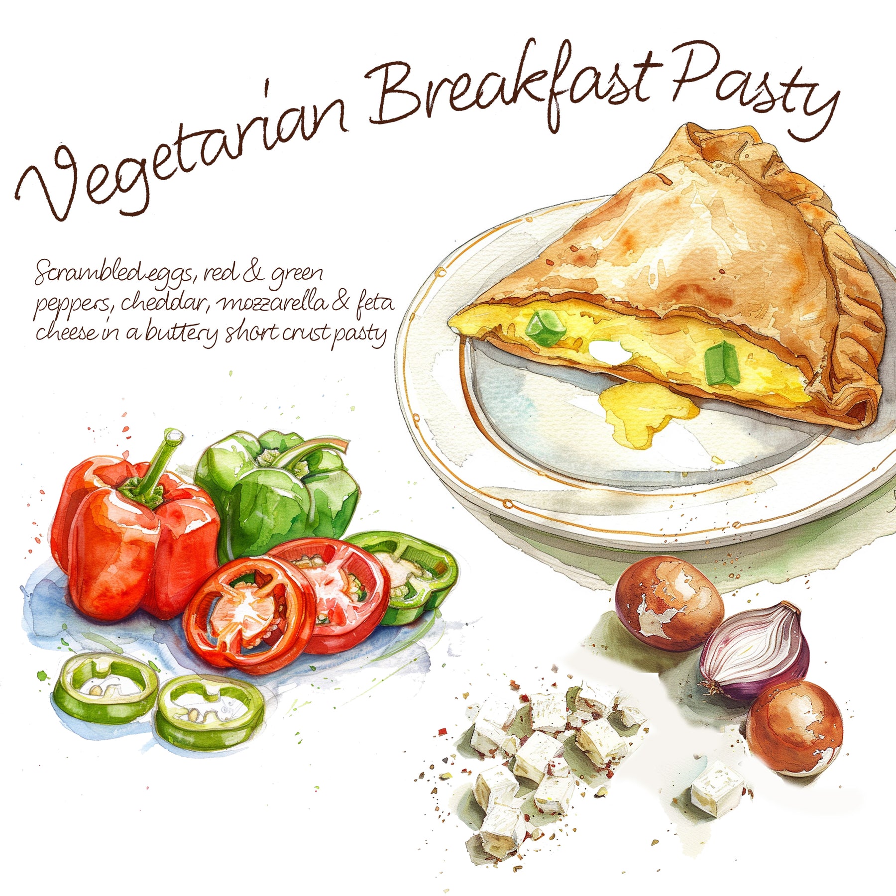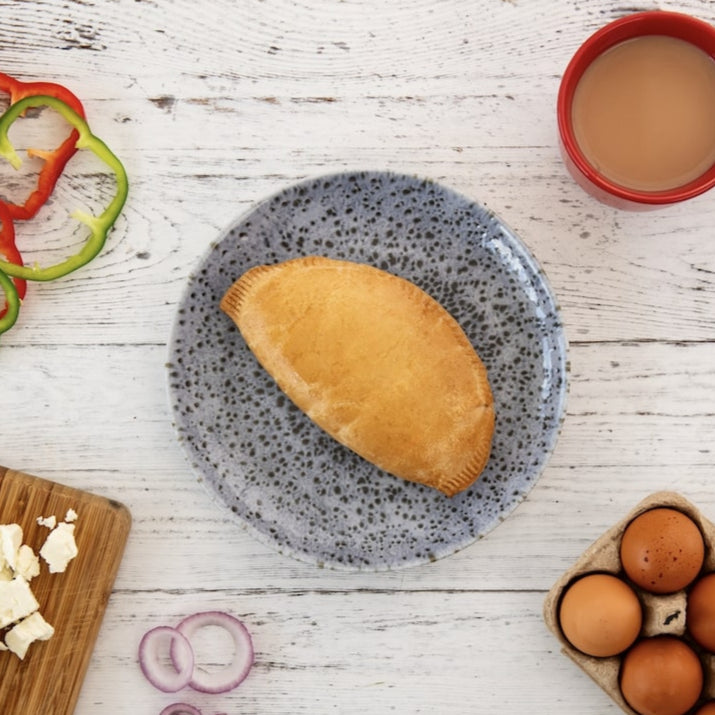 Scrambled Eggs, Red & Green Peppers, Cheddar, Mozzarella & Feta Cheese in a Buttery Shortcrust Pasty