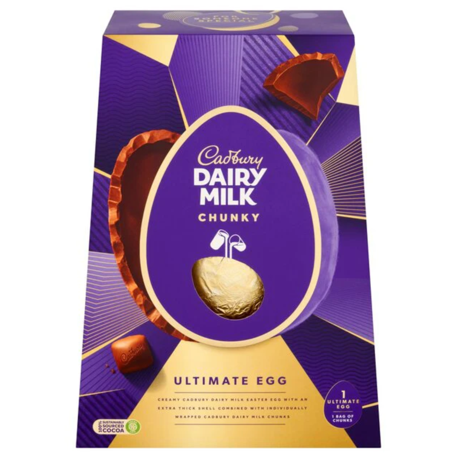 Creamy Cadbury dairy milk Easter Egg with an extra thick shell combined with individually wrapped Cadbury dairy milk chunks