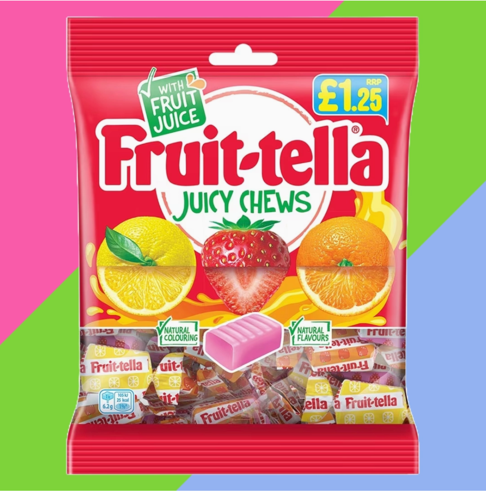 * Strawberry, Orange, and Lemon flavoured chewy sweets * Larger than a standard Fruittella chew. Fruittella Juicy Chews are larger than the standard Fruittella chew, meaning they’re packed full of more juicy flavours. Individually wrapped strawberry, orange, and lemon flavoured chew sweets made with real fruit juices and natural colourings. They’re also dairy, gluten, and nut free so everyone can enjoy the fruity taste of Fruittella. These £1.25 price marked bags are great value for your customers. Maximise sales by displaying them alongside your other sweet treat bags.