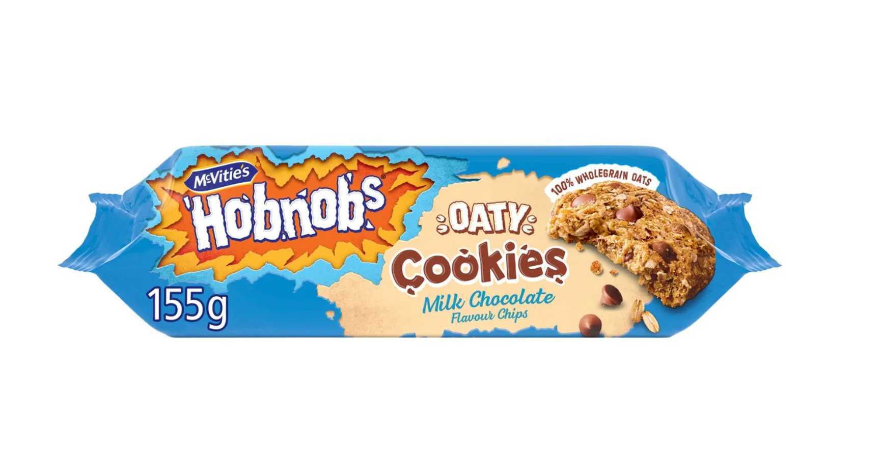 Our famous Hobnobs biscuits are now in a new format: Hobnobs Oaty Cookies: a delicious chewy cookies, with milk chocolate flavour chips and golden syrup flavour. Baked with 100% wholegrain oats, for a unique taste and texture!