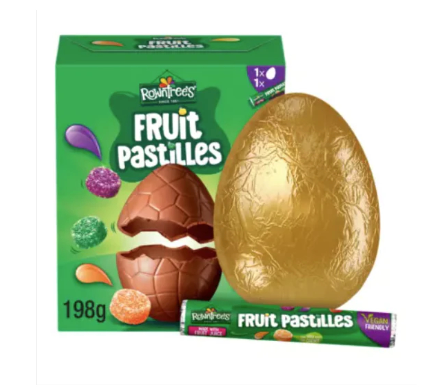 Rowntree’s® large milk chocolate egg, accompanied with a full size tube of Rowntree’s® Fruit Pastilles.