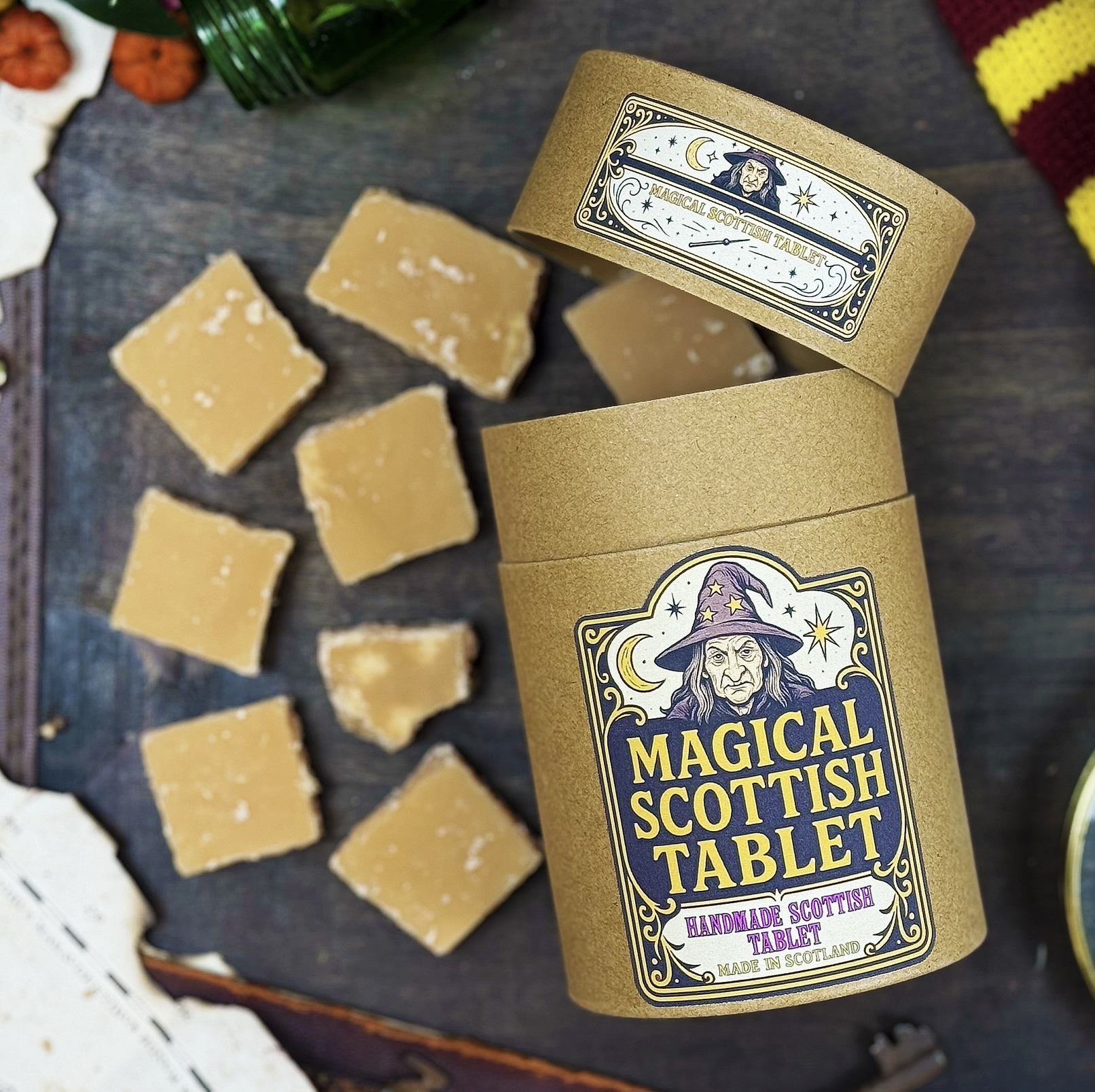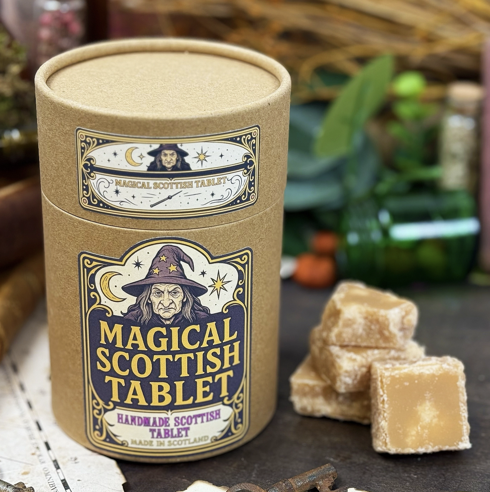 Magical Scottish Tablet – Traditional Butter Tablet A spellbinding twist on a classic, Magical Scottish Tablet brings the rich, melt-in-the-mouth magic of traditional Scottish tablet to life. Buttery, crumbly, and impossibly moreish, this handmade treat captures the warmth of the Highlands in every bite. Crafted in small batches in bonnie Scotland, it’s perfect for sharing — or keeping all to yourself. 300g of handmade, small-batch Scottish tablet Made in Scotland with traditional ingredients and methods Presented in a rustic brown collector’s tube with a magical touch Ingredients: Sugar, glucose syrup, condensed milk butter (milk) (4%), glycerine, fondant (sugar, glucose syrup, water), sunflower lecithin.